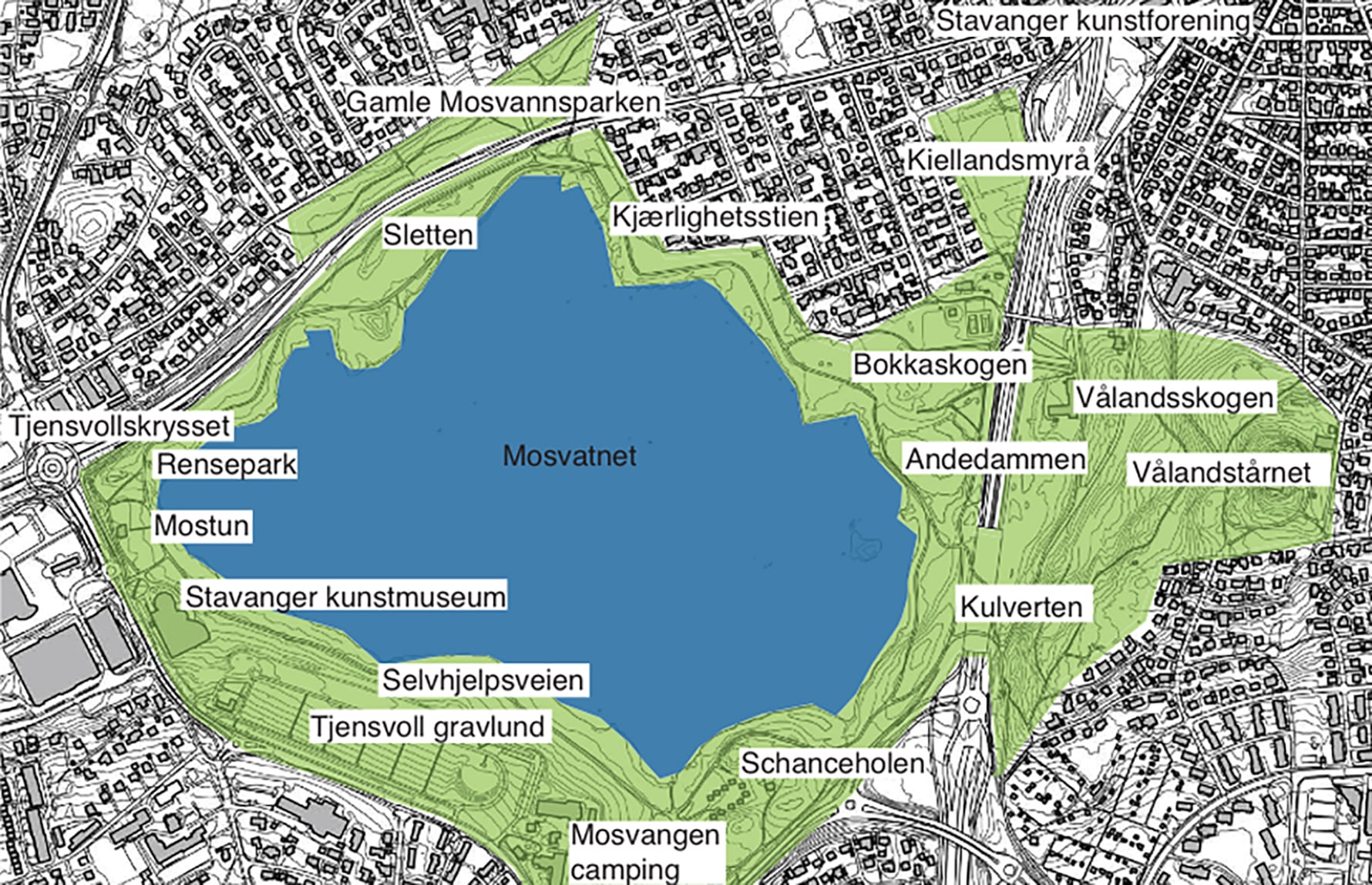 Aktivitets- og oppholdsområder: Mosvangen Camping, Stavanger kunstmuseum, Sletten, Mosvannsparken (vest), Ved Kjærlighetsstien, Bokkaskogen, Kiellandsmyrå, Mostun natursenter, Vålandsskogen (4)